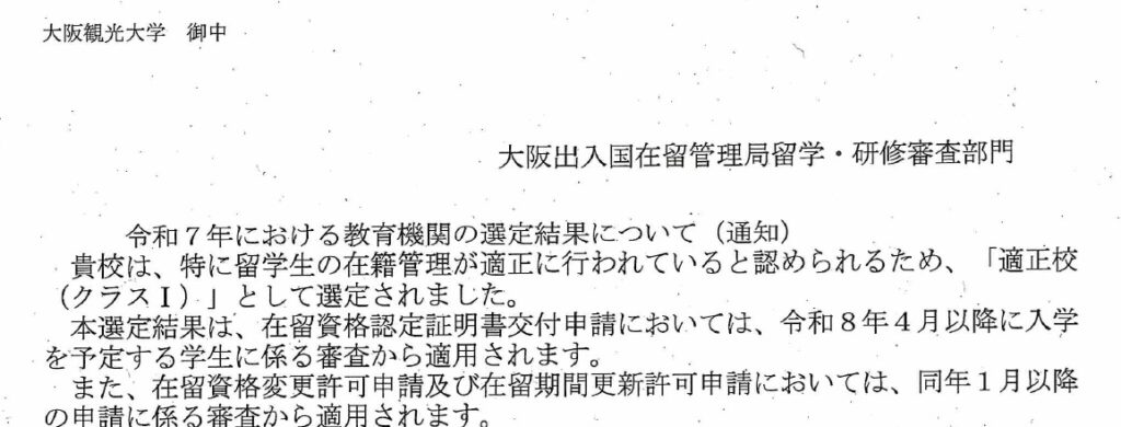 大阪出入国在留管理局より、今年度も「適正校(クラスⅠ)」に選定されました!
